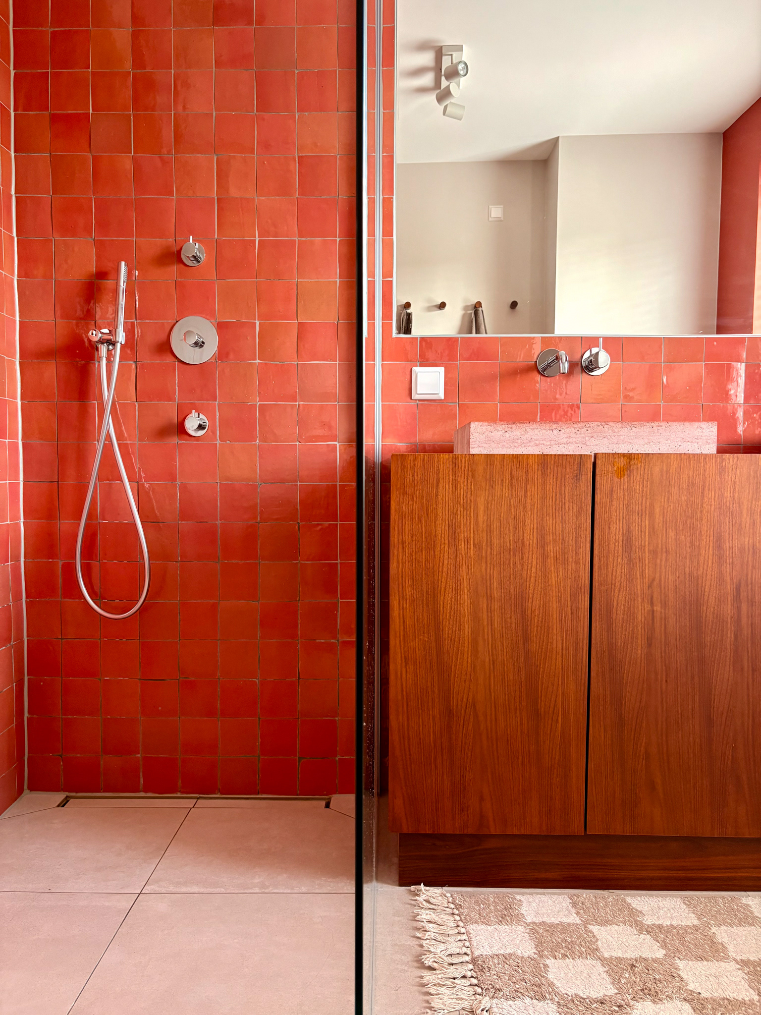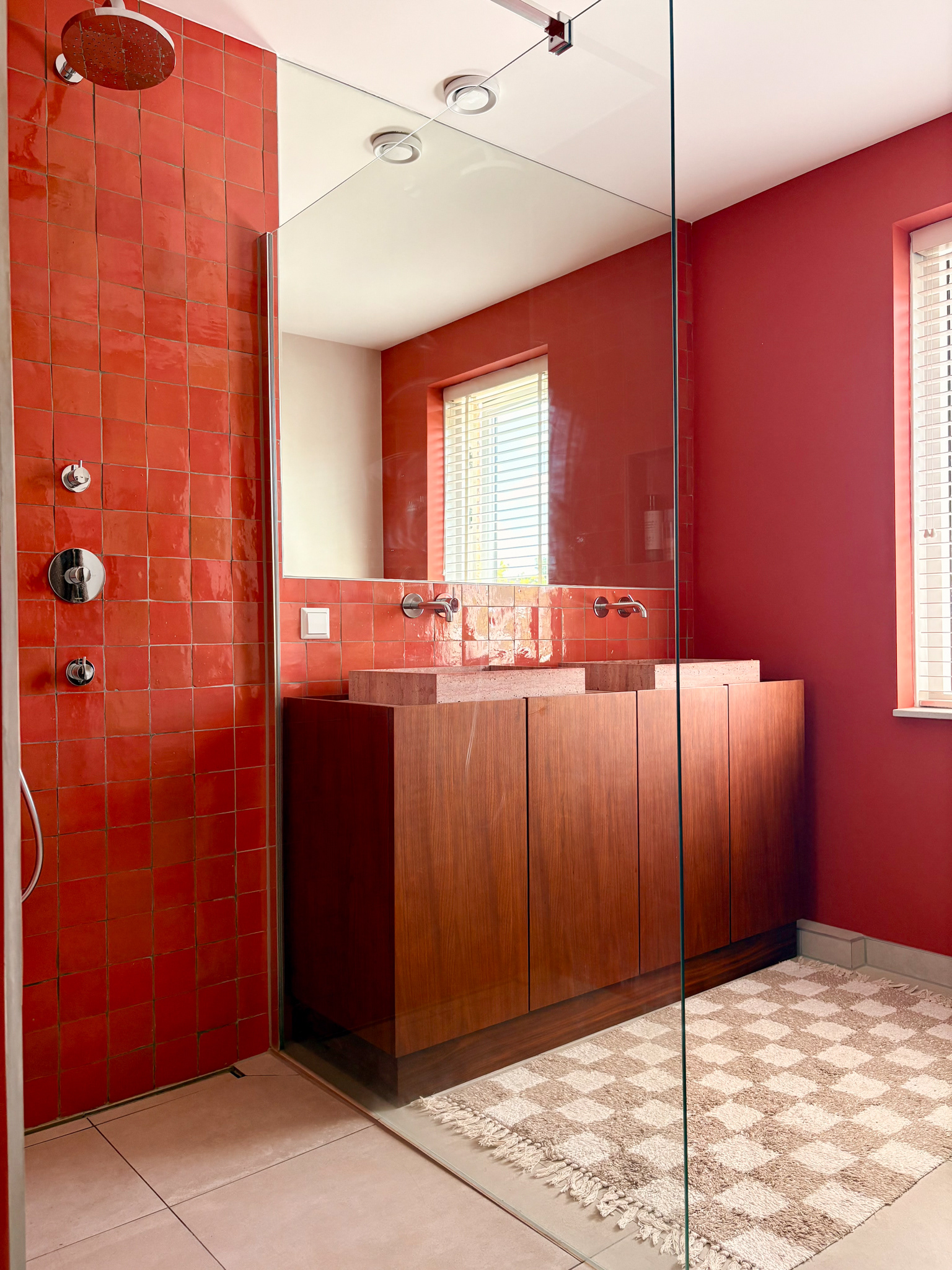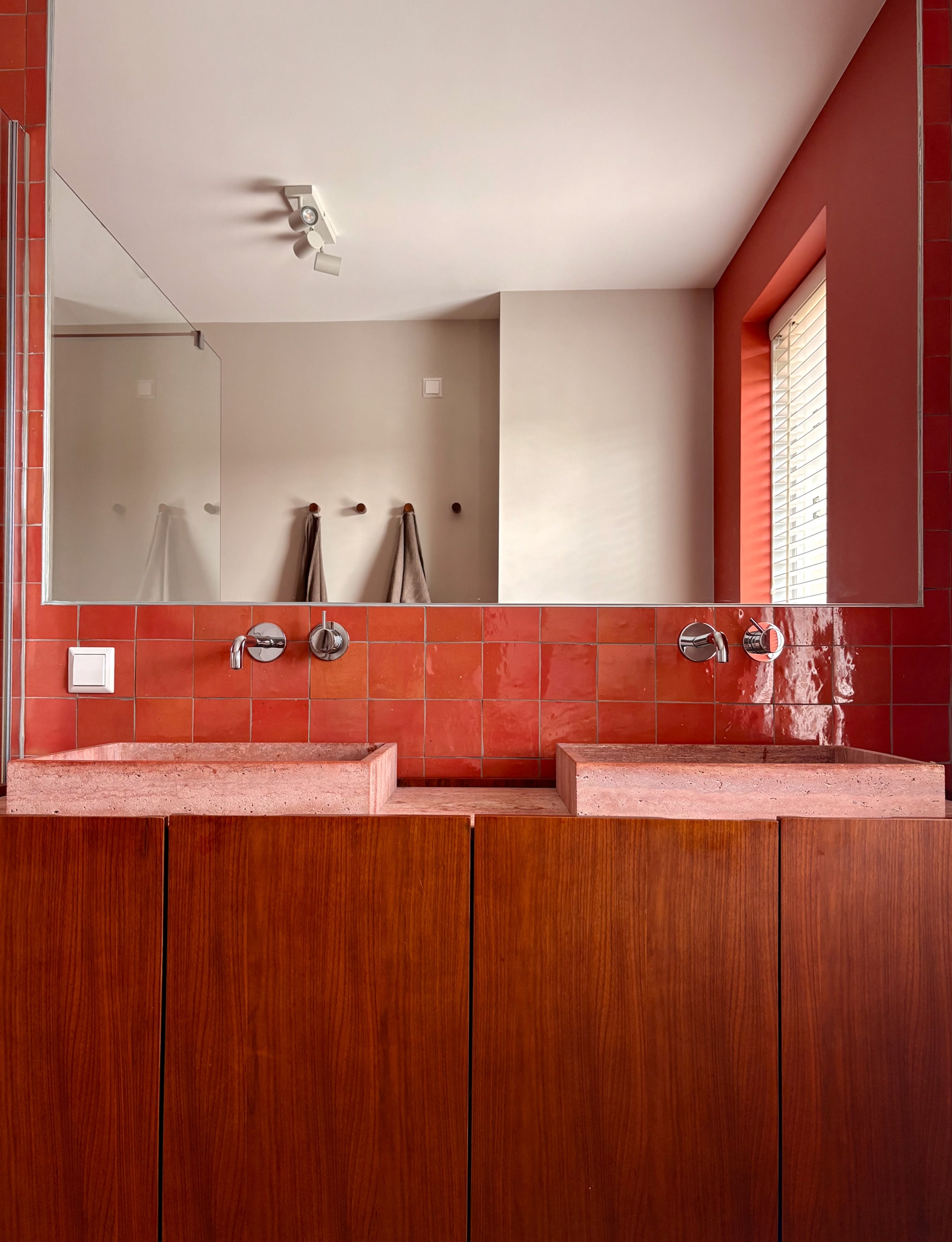 Bathroom renovation for a young family in Barendrecht. A calm and spatial but colorful bathroom with natural and authentic materials.